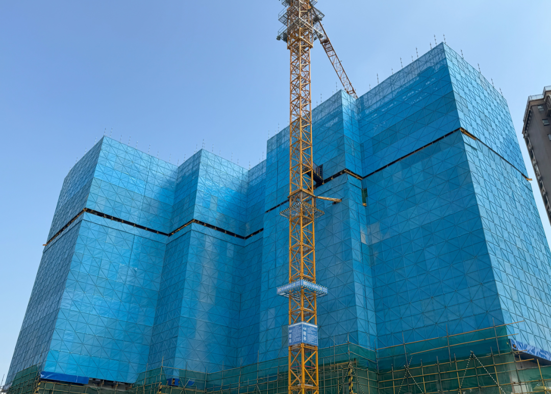 走進施工現(xiàn)場,極目新聞記者看到,在建的5棟高層建筑外立面上采用藍色的花籃懸挑腳手架,既美觀又安全。?